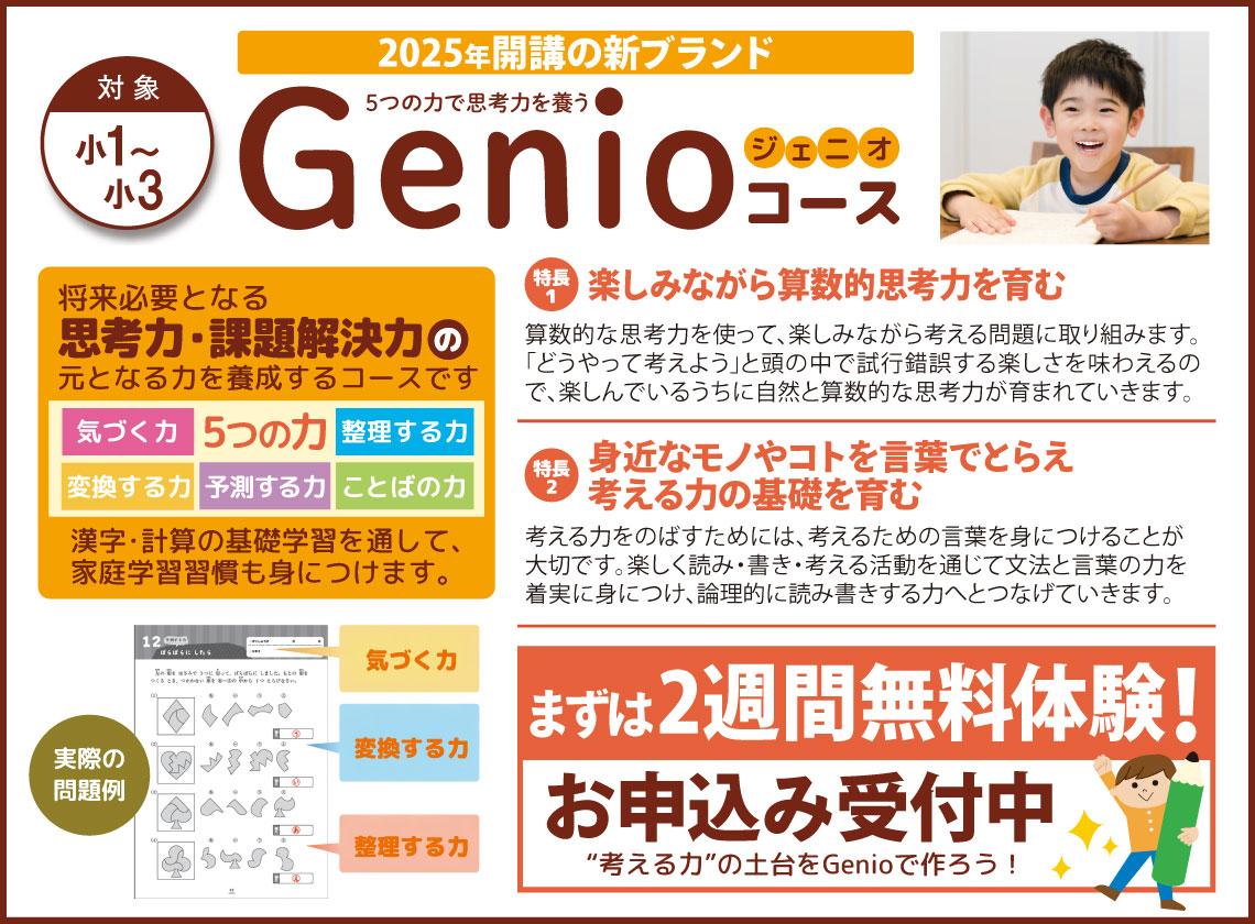 お試し体験会(無料体験授業)Genioコース2週間無料体験(小1~3)個別相談・個別説明会資料請求入塾申込みその他(「内容」へご記入ください)